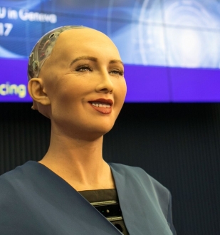 Slika: Sophia, proizvod komapnije Hanson Robotics, govori na svjetskoj konferenciji AI for Good u…